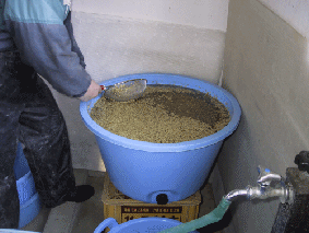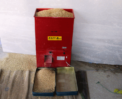 ノギ取り機の上から種籾を入れると、機体の左側からはゴミと一緒に軽い籾が飛ばされて