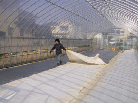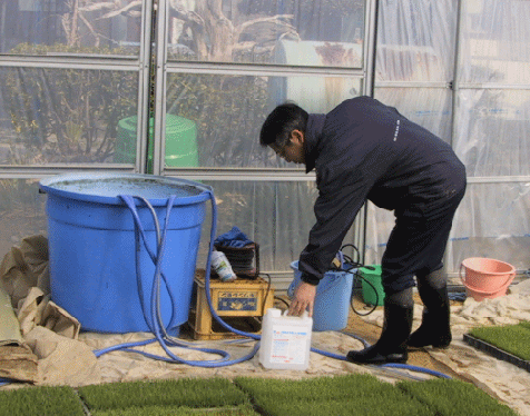 きょうは肥料と苗立枯病(カビ)の予防のため殺菌剤を散布します。