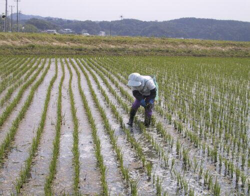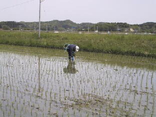田植え機械でうまく植えられずに欠株になったところに手作業で補植します。 一日中作業しているわけではありませんが、毎年一週間ほどかかるようです。
