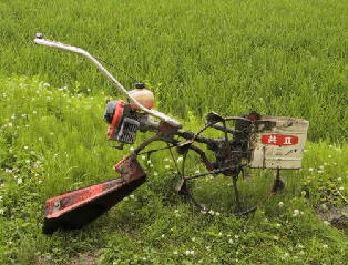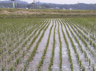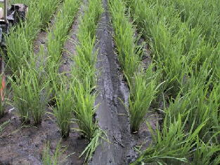 ったので水を落として田んぼの土が軽くひび割れするくらいに乾かします。 「中干し」は地中のガスを抜いて稲の根張りを良くし、倒伏防止に効果があり、「みぞ切り」 は「中干し」するのに無くてはならない作業です。 溝切り機はエンジンで前の車輪を回転させて、後の溝切り板で田んぼに溝を切って行き ます。切り終わった溝をつないでおくと入水・落水を速やかに行うことが出来ます。 「みぞ切り」はその後の水管理のうち、特に収穫時期の排水に効果があります。