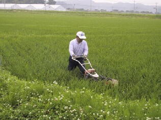 田植えが終わってから稲刈りまでは、田んぼの見まわりが欠かせません。 苗の成長具合やアゼからの漏水箇所の有無を毎朝見て回ります。 水の管理やアゼの草刈、苗の成長に合わせた病害虫の防除などの仕事が稲刈りまで 続きます。