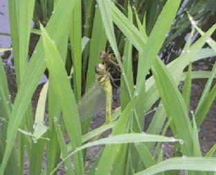 赤とんぼが羽化していました。 赤とんぼは卵で冬を越し、田んぼに水が入った6月前後に卵からかえって「ヤゴ」になり、 今頃になると羽化し、夏には涼しい山のほうに移動して秋になると再び田んぼに帰ってきて 産卵します。 近年、使用する農薬を減らしていることもあって、たくさんの赤とんぼの羽化を見ることが できるようになりました。