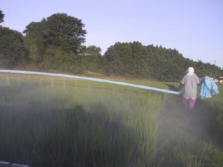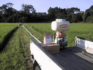 が低下したり、玄米の表面が汚損されることによりお米の品質にも影響を及ぼします。 動力散布機に粉剤用の散布ホースをつないで薬剤を散布します。