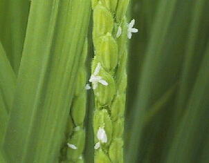 穂のひとつひとつのモミから、白い小さな花か咲いています。