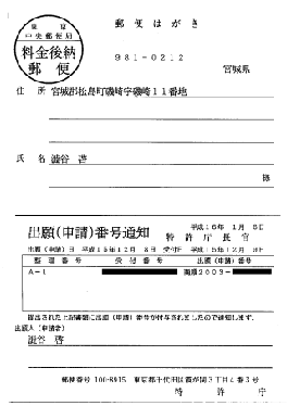 出願番号の通知