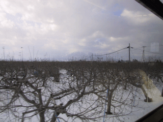 広いりんご園の向こうには雪をかぶった岩木山が見えます。