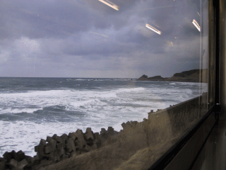 列車の中から見る冬の日本海もさすがに迫力がありますねえ。