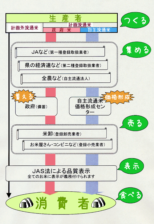 そもそも米の流通システムは、生産・集荷・セリ(卸売価格の決定)・卸売・小売といった流れのように、他の農産物