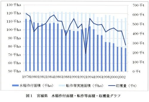 このように生産調整によって、2003年では生産調整前の4分の3の面積となり作付面積は着実に減少し続けてい