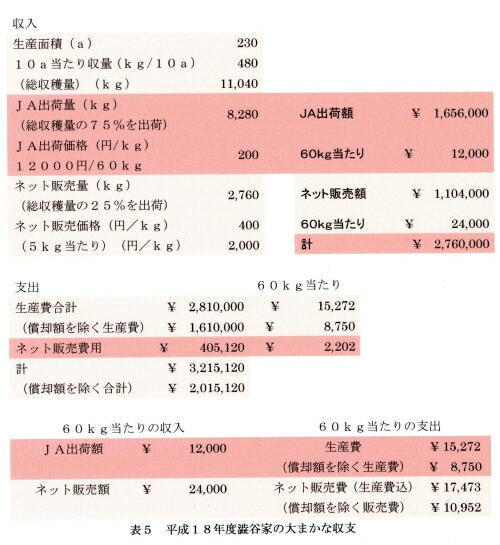 表5は、平成18年度の澁谷家の大まかな収支をまとめたものである。この年はJAへの出荷に加えて、インターネ