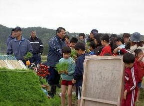仙台農協「愛・らんど松島」での開校式の後、さっそく田んぼに移動して田植えの体験と
