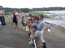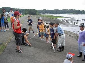 目盛りのついたデカイ物差しのスタッフを見た後は、実際に海面と田んぼのところに