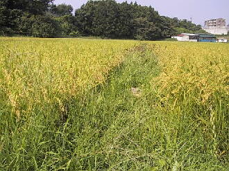 前回草刈りしてから1ヶ月と少し、アゼの草はイネの草丈を追い越すような勢いで